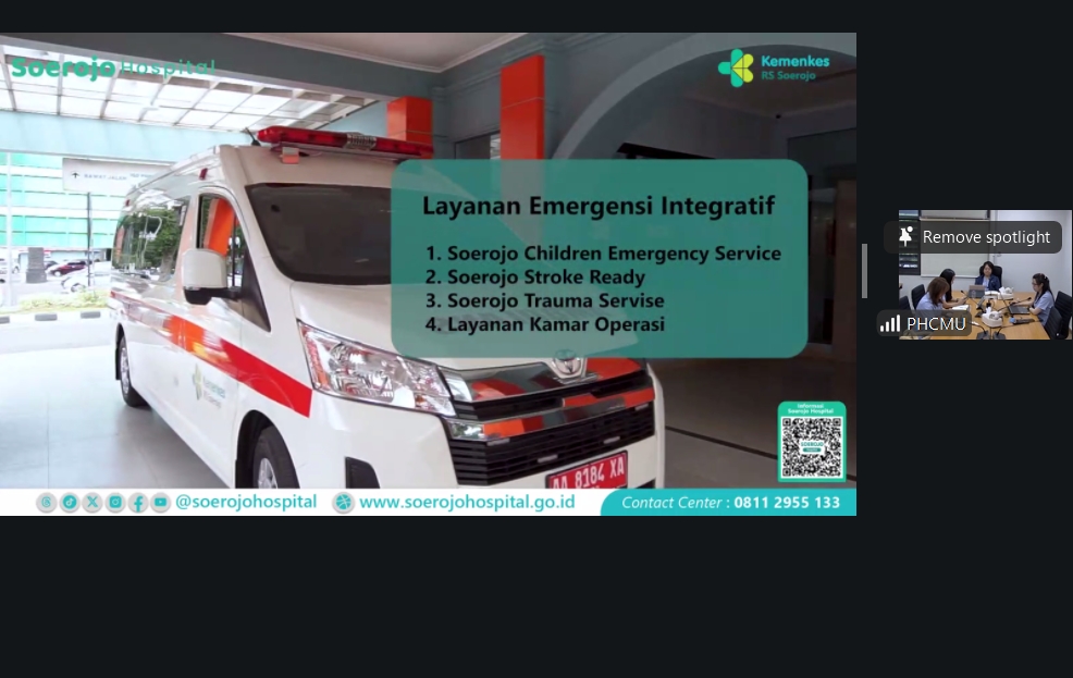 รศ.ดร. วราภรณ์ บุญเชียง คณบดีคณะสาธารณสุขศาสตร์, ผู้ช่วยศาสตราจารย์ ดร.อักษรา ทองประชุม หัวหน้าสำนักวิชาฯ และคณจารย์ ได้ประชุมเพื่อทำการปรึกษาหารือ เกี่ยวกับการทำความร่วมมือด้านการวิจัยและการบริการวิชาการ กับ Soerojo Hospital โดยมี Dr. Rukmono Siswishanto, President Director, Dr.Ratna Dewi Pangestuti, Nursing Director และผู้บริหารโรงพยาบาลร่วมประชุม