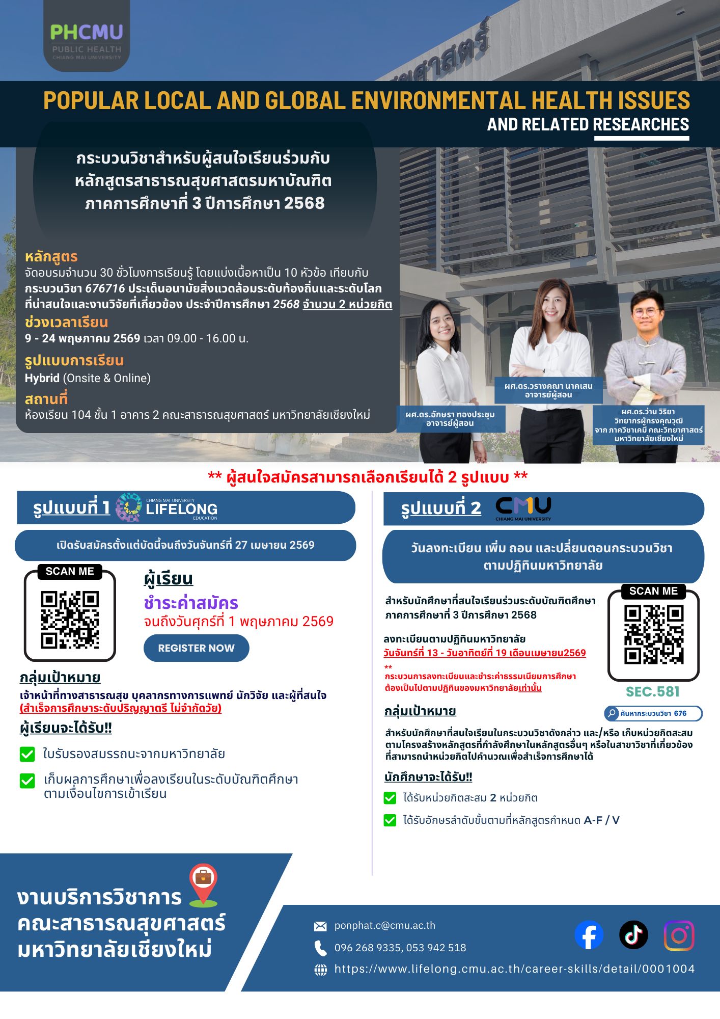 เปิดแล้ว หลักสูตรระยะสั้นคณะสาธารณสุขศาสตร์ กระบวนวิชาน่าสนใจด้านสาธารณสุข ภาคฤดูร้อน ปีการศึกษา 2568 3 กระบวนวิชา 1. Principle of Health Economics หลักเศรษฐศาสตร์ การวิเคราะห์ต้นทุน ความคุ้มค่าทางสุขภาพ และการตัดสินใจเชิงนโยบายด้านสาธารณสุข https://www.lifelong.cmu.ac.th/career-skills/detail/0001002 2.Popular Local and Global Environmental Health Issues and Related Researches ศึกษาประเด็นปัญหาสุขภาพสิ่งแวดล้อมทั้งระดับท้องถิ่นและระดับโลก พร้อมแนวทางการวิจัยที่เกี่ยวข้อง https://www.lifelong.cmu.ac.th/career-skills/detail/0001004 3.One Health Approach in Public Health แนวคิด One Health ที่เชื่อมโยงสุขภาพคน สัตว์ และสิ่งแวดล้อม เพื่อรับมือปัญหาสุขภาพยุคใหม่อย่างบูรณาการ https://www.lifelong.cmu.ac.th/career-skills/detail/0001003 รูปแบบการเรียน Hybrid (Onsite + Online) ณ คณะสาธารณสุขศาสตร์ มหาวิทยาลัยเชียงใหม่ เรียนรู้ 30 ชั่วโมง / เทียบเท่า 2 หน่วยกิต ผู้สนใจสามารถเลือกเรียนได้ 2 รูปแบบ 1️ สมัครเรียนผ่าน CMU Lifelong Education 2️ ลงทะเบียนเป็นกระบวนวิชาของมหาวิทยาลัยเชียงใหม่ >> https://regist.reg.cmu.ac.th/ สแกน QR Code ในภาพเพื่อสมัครเรียน งานบริการวิชาการ คณะสาธารณสุขศาสตร์ มหาวิทยาลัยเชียงใหม่ #PHCMU #CMULifelongEducation #PublicHealthCMU #CMU
