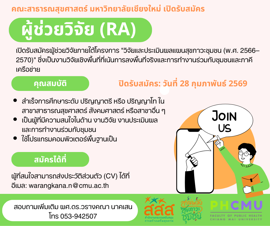 คณะสาธารณสุขศาสตร์ มหาวิทยาลัยเชียงใหม่ กำลังเปิดรับสมัครผู้ช่วยวิจัยภายใต้โครงการ "วิจัยและประเมินผลแผนสุขภาวะชุมชน (พ.ศ. 2566–2570)" ภายใต้สำนักงานกองทุนสนับสนุนการสร้างเสริมสุขภาพ (สสส.) โดยมีรายละเอียดดังนี้ คุณสมบัติของผู้สมัคร: • สำเร็จการศึกษาระดับ ปริญญาตรี หรือ ปริญญาโท ในสาขา สาธารณสุขศาสตร์ สังคมศาสตร์ หรือสาขาอื่น ๆ ที่เกี่ยวข้อง • เป็นผู้ที่มีความสนใจในด้าน งานวิจัย งานประเมินผล และการทำงานร่วมกับชุมชน เงื่อนไขการจ้างและค่าตอบแทน: • เริ่มปฏิบัติงาน: ประมาณช่วงเดือน กุมภาพันธ์ – มีนาคม 2569 (ระยะเวลา 2 ปี) • ค่าตอบแทน: เป็นไปตามที่ระบุไว้ใน ระเบียบของโครงการ วิธีการสมัครและกำหนดการ: • ผู้ที่สนใจสามารถส่งประวัติส่วนตัว (CV) ได้ที่อีเมล: warangkana.n@cmu.ac.th • ปิดรับสมัคร: วันที่ 28 กุมภาพันธ์ 2569 สอบถามข้อมูลเพิ่มเติม: หากมีข้อสงสัยเพิ่มเติม สามารถติดต่อได้ที่ ผศ.ดร.วรางคณา นาคเสน คณะสาธารณสุขศาสตร์ มหาวิทยาลัยเชียงใหม่ หมายเลขโทรศัพท์ 053-942507