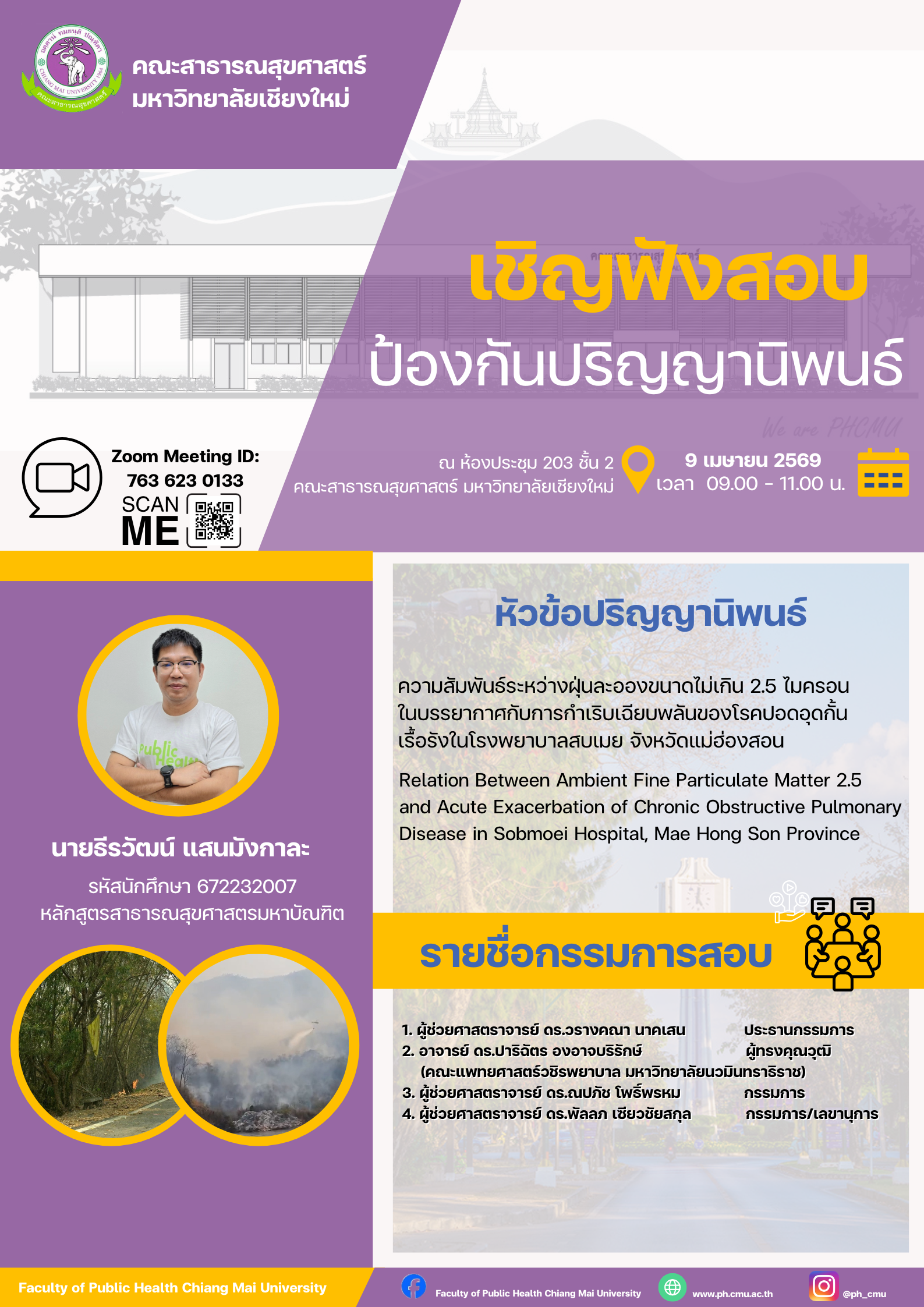 เชิญฟังสอบป้องกันปริญญานิพนธ์ ความสัมพันธ์ระหว่างฝุ่นละอองขนาดไม่เกิน 2.5 ไมครอนในบรรยากาศกับการกำเริบเฉียบพลันของโรคปอดอุดกั้นเรื้อรังในโรงพยาบาลสบเมย จังหวัดแม่ฮ่องสอน Relation Between Ambient Fine Particulate Matter 2.5 and Acute Exacerbation of Chronic Obstructive Pulmonary Disease in Sobmoei Hospital, Mae Hong Son Province โดย นายธีรวัฒน์ แสนมังกาละ รหัสประจำตัว 672232007 นักศึกษาระดับปริญญาโท วันพฤหัสบดีที่ 9 เมษายน พ.ศ. 2569 เวลา 09.00 – 11.00 น. ณ ห้องประชุม 203 ชั้น 2 คณะสาธารณสุขศาสตร์ มหาวิทยาลัยเชียงใหม่ หรือผ่านระบบ Zoom Meeting ID : 763 623 0133 https://cmu-th.zoom.us/j/7636230133?omn=92936017622