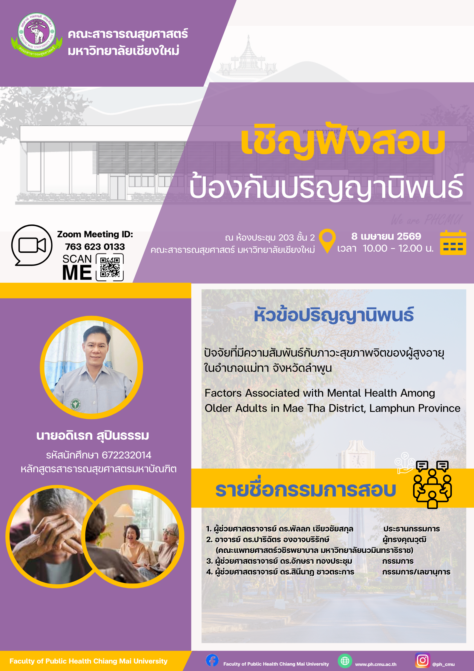 เชิญฟังสอบป้องกันปริญญานิพนธ์ ปัจจัยที่มีความสัมพันธ์กับภาวะสุขภาพจิตของผู้สูงอายุ ในอำเภอแม่ทา จังหวัดลำพูน Factors Associated with Mental Health Among Older Adults in Mae Tha District, Lamphun Province โดย นายอดิเรก สุปินธรรม รหัสประจำตัว 672232014 นักศึกษาระดับปริญญาโท วันพุธที่ 8 เมษายน พ.ศ. 2569 เวลา 10.00 – 12.00 น. ณ ห้องประชุม 203 ชั้น 2 คณะสาธารณสุขศาสตร์ มหาวิทยาลัยเชียงใหม่ หรือผ่านระบบ Zoom Meeting ID : 763 623 0133 https://cmu-th.zoom.us/j/7636230133?omn=96836653616