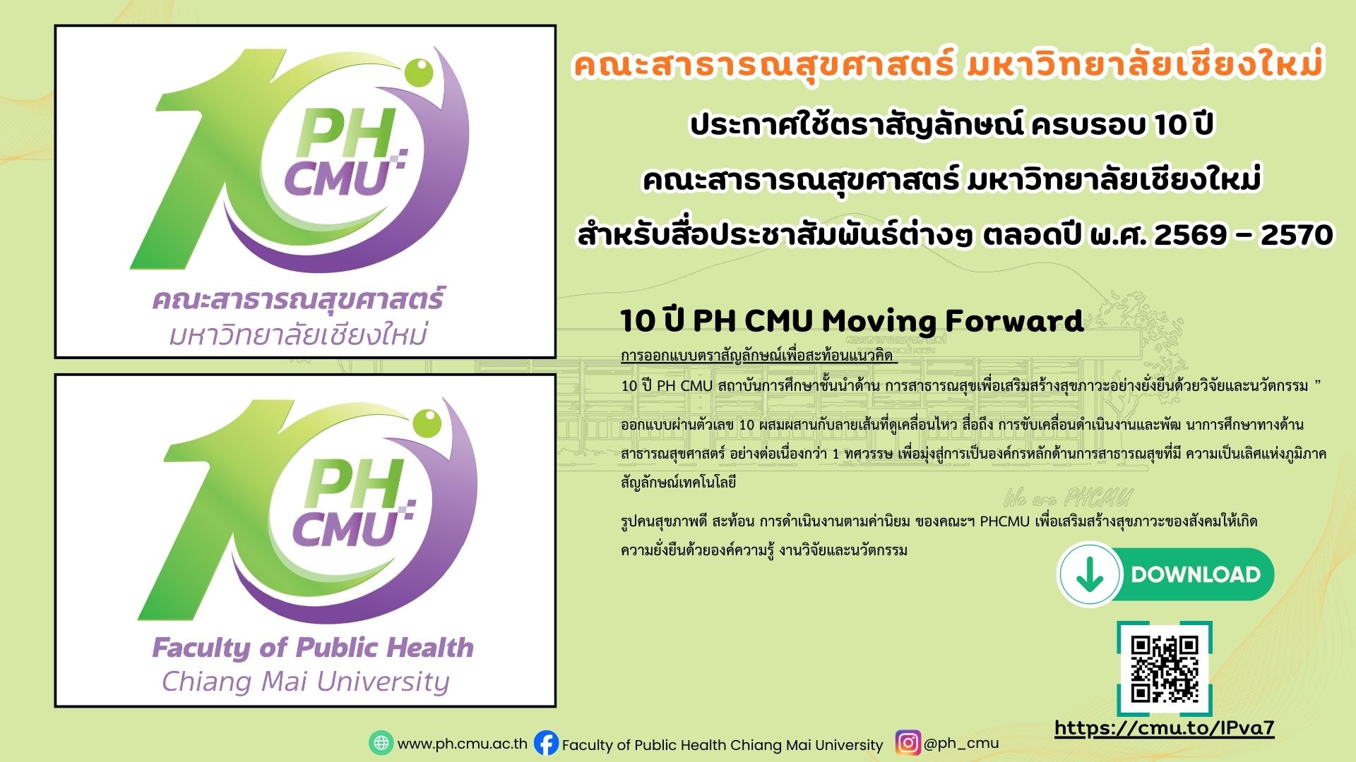 คณะสาธารณสุขศาสตร์ มหาวิทยาลัยเชียงใหม่ ประกาศใช้ตราสัญลักษณ์ ครบรอบ 10 ปี อย่างเป็นทางการ คณะสาธารณสุขศาสตร์ คณะสาธารณสุขศาสตร์ มหาวิทยาลัยเชียงใหม่ ประกาศใช้ตราสัญลักษณ์เนื่องในโอกาสครบรอบ 10 ปี สำหรับใช้ในสื่อประชาสัมพันธ์ต่าง ๆ ตลอดปี พ.ศ. 2569 – 2570 ภายใต้แนวคิด “10 ปี PH CMU Moving Forward” - การออกแบบสะท้อนอัตลักษณ์และวิสัยทัศน์ของคณะฯ ในการเป็นสถาบันการศึกษาชั้นนำด้านสาธารณสุข - เลข “10” ที่ผสานเส้นสายแห่งการเคลื่อนไหว สื่อถึงพลัง ความก้าวหน้า และการพัฒนาอย่างต่อเนื่อง - รูปทรงที่โอบล้อมสื่อถึงความร่วมมือ การบูรณาการองค์ความรู้ งานวิจัย และนวัตกรรม - ตอกย้ำพันธกิจในการสร้างเสริมสุขภาวะของสังคมอย่างยั่งยืน ตลอดระยะเวลากว่า 10 ปี คณะฯ มุ่งมั่นขับเคลื่อนงานด้านสาธารณสุข เพื่อยกระดับคุณภาพชีวิตของประชาชนทั้งในระดับพื้นที่ ระดับประเทศ และระดับนานาชาติ สามารถดาวน์โหลดไฟล์ตราสัญลักษณ์ได้ที่ https://cmu.to/IPva7 #10ปีPHCMU #PHCMUMovingForward #สาธารณสุขมช #ChiangMaiUniversity