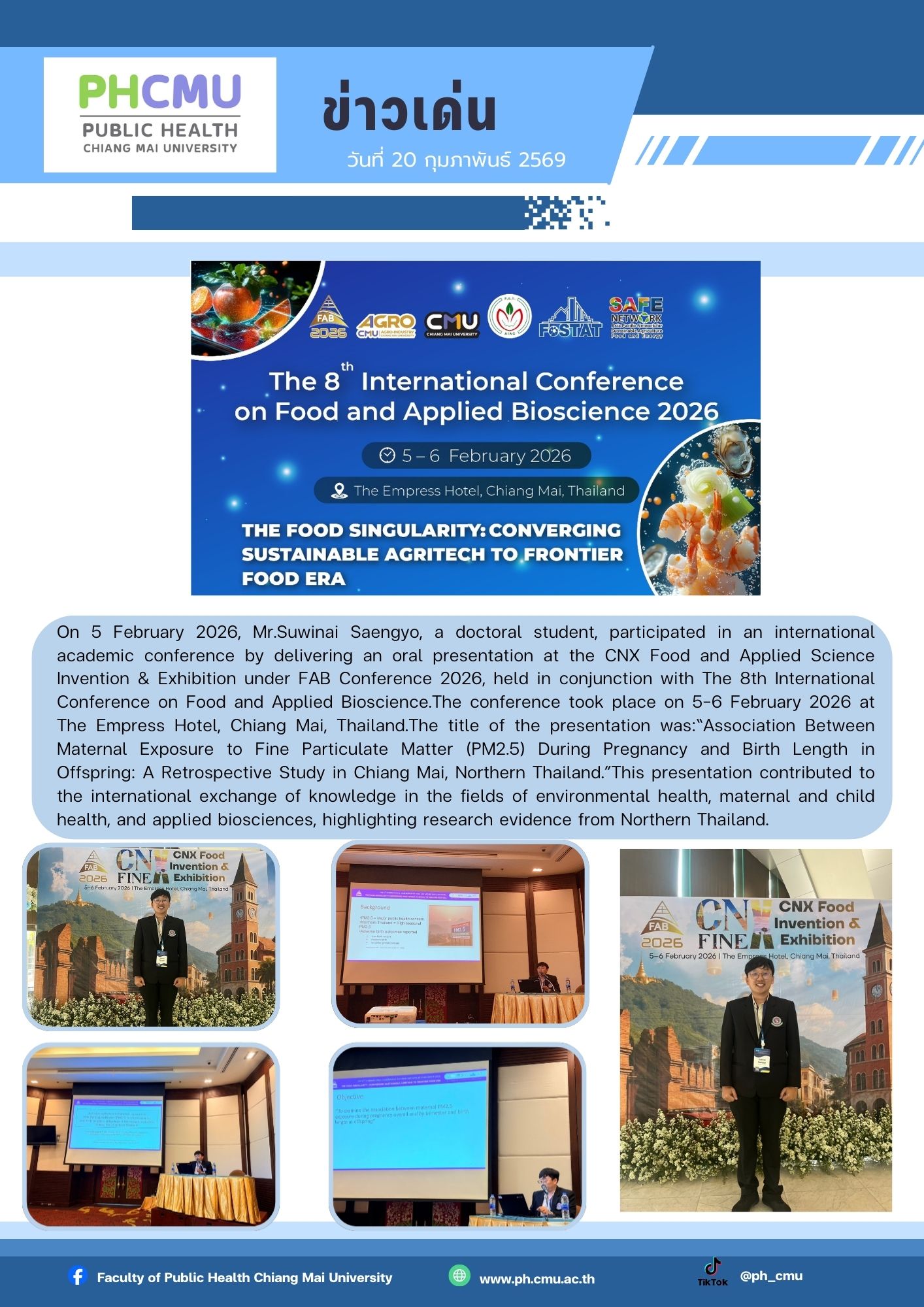 On 5 February 2026, Mr.Suwinai Saengyo, a doctoral student, participated in an international academic conference by delivering an oral presentation at the CNX Food and Applied Science Invention & Exhibition under FAB Conference 2026, held in conjunction with The 8th International Conference on Food and Applied Bioscience. The conference took place on 5–6 February 2026 at The Empress Hotel, Chiang Mai, Thailand. The title of the presentation was: “Association Between Maternal Exposure to Fine Particulate Matter (PM2.5) During Pregnancy and Birth Length in Offspring: A Retrospective Study in Chiang Mai, Northern Thailand.” This presentation contributed to the international exchange of knowledge in the fields of environmental health, maternal and child health, and applied biosciences, highlighting research evidence from Northern Thailand.