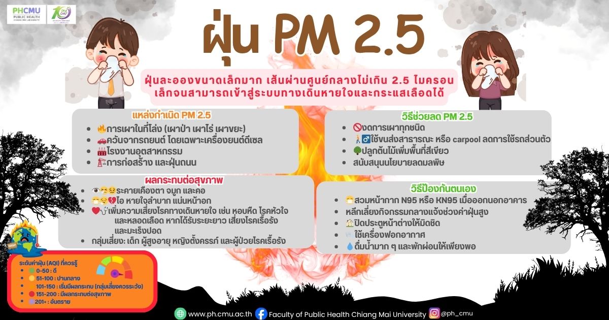 PM 2.5 คือ ฝุ่นละอองขนาดเล็กมาก เล็กกว่าเส้นผมถึง 20 เท่า สามารถเข้าสู่ปอดและกระแสเลือดได้โดยตรง -แหล่งกำเนิดหลัก การเผาในที่โล่ง (เผาป่า เผาไร่) ควันรถยนต์ โรงงานอุตสาหกรรม ฝุ่นจากการก่อสร้าง -ผลกระทบต่อสุขภาพ ระคายเคืองตา จมูก และคอ ไอ หายใจลำบาก แน่นหน้าอก เสี่ยงโรคทางเดินหายใจ โรคหัวใจและหลอดเลือด หากสะสมระยะยาว เสี่ยงโรคเรื้อรังและมะเร็งปอด - กลุ่มเสี่ยง เด็ก | ผู้สูงอายุ | หญิงตั้งครรภ์ | ผู้ป่วยโรคเรื้อรัง - วิธีป้องกัน