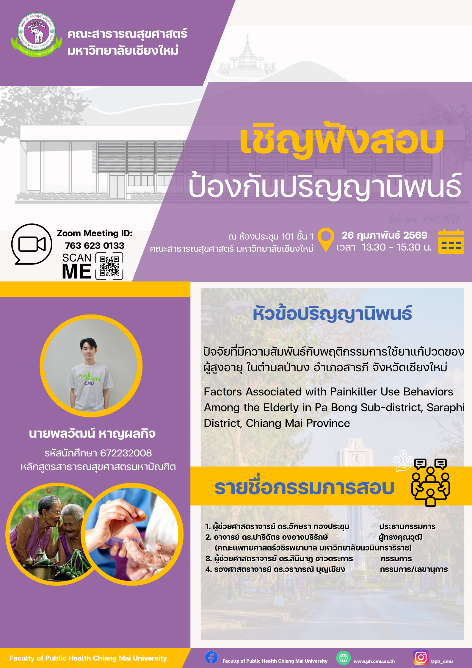 เชิญฟังสอบป้องกันปริญญานิพนธ์ ปัจจัยที่มีความสัมพันธ์กับพฤติกรรมการใช้ยาแก้ปวดของผู้สูงอายุ ในตำบลป่าบง อำเภอสารภี จังหวัดเชียงใหม่ Factors Associated with Painkiller Use Behaviors Among the Elderly in Pa Bong Sub-district, Saraphi District, Chiang Mai Province โดย นายพลวัฒน์ หาญผลกิจ รหัสประจำตัว 672232008 นักศึกษาระดับปริญญาโท วันพฤหัสบดีที่ 26 กุมภาพันธ์ พ.ศ. 2569 เวลา 13.30 – 15.30 น. ณ ห้องเรียน 101 ชั้น 1 คณะสาธารณสุขศาสตร์ มหาวิทยาลัยเชียงใหม่ หรือผ่านระบบ Zoom Meeting ID : 763 623 0133 https://cmu-th.zoom.us/j/7636230133?omn=97586600967