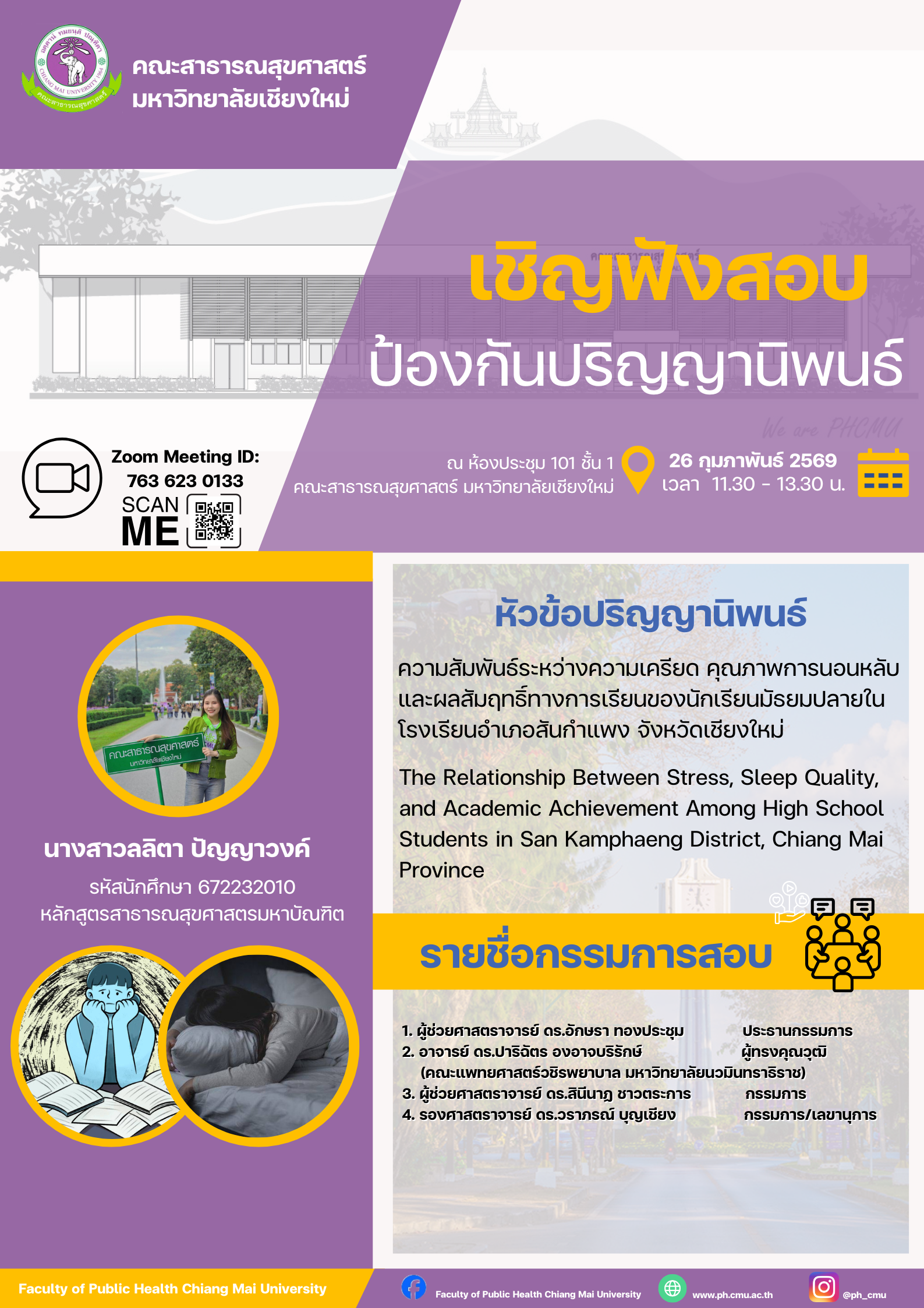 เชิญฟังสอบป้องกันปริญญานิพนธ์ ความสัมพันธ์ระหว่างความเครียด คุณภาพการนอนหลับและผลสัมฤทธิ์ทางการเรียนของนักเรียนมัธยมปลายในโรงเรียนอำเภอสันกำแพง จังหวัดเชียงใหม่ The Relationship Between Stress, Sleep Quality, and Academic Achievement Among High School Students in San Kamphaeng District, Chiang Mai Province โดย นางสาวลลิตา ปัญญาวงค์ รหัสประจำตัว 672232010 นักศึกษาระดับปริญญาโท วันพฤหัสบดีที่ 26 กุมภาพันธ์ พ.ศ. 2569 เวลา 11.30 – 13.30 น. ณ ห้องเรียน 101 ชั้น 1 คณะสาธารณสุขศาสตร์ มหาวิทยาลัยเชียงใหม่ หรือผ่านระบบ Zoom Meeting ID : 763 623 0133 https://cmu-th.zoom.us/j/7636230133?omn=97586600967