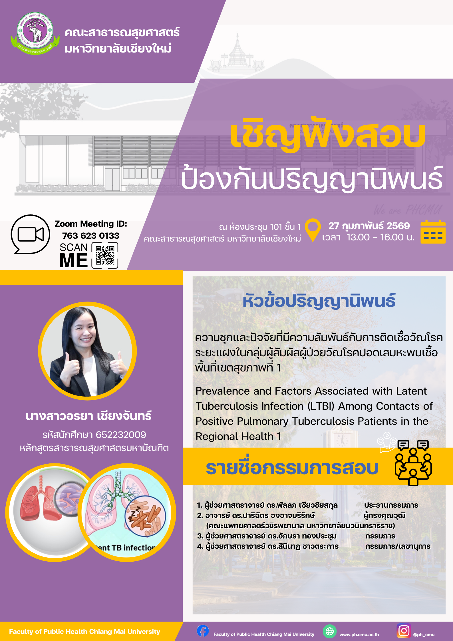 เชิญฟังสอบป้องกันปริญญานิพนธ์ ความชุกและปัจจัยที่มีความสัมพันธ์กับการติดเชื้อวัณโรคระยะแฝงในกลุ่มผู้สัมผัสผู้ป่วยวัณโรคปอดเสมหะพบเชื้อ พื้นที่เขตสุขภาพที่ 1 Prevalence and Factors Associated with Latent Tuberculosis Infection (LTBI) Among Contacts of Positive Pulmonary Tuberculosis Patients in the Regional Health 1 โดย นางสาวอรยา เชียงจันทร์ รหัสประจำตัว 652232009 นักศึกษาระดับปริญญาโท วันศุกร์ที่ 27 กุมภาพันธ์ พ.ศ. 2569 เวลา 13.00 – 16.00 น. ณ ห้องเรียน 101 ชั้น 1 คณะสาธารณสุขศาสตร์ มหาวิทยาลัยเชียงใหม่ หรือผ่านระบบ Zoom Meeting ID : 763 623 0133 https://cmu-th.zoom.us/j/7636230133?omn=97586600967