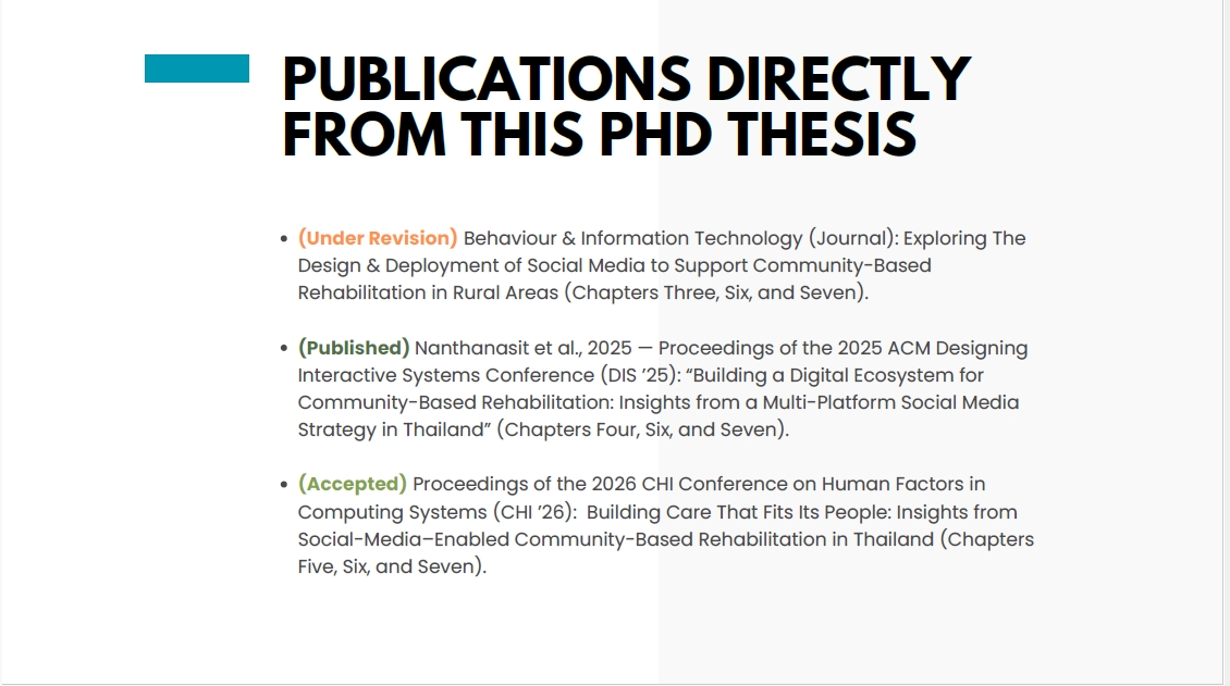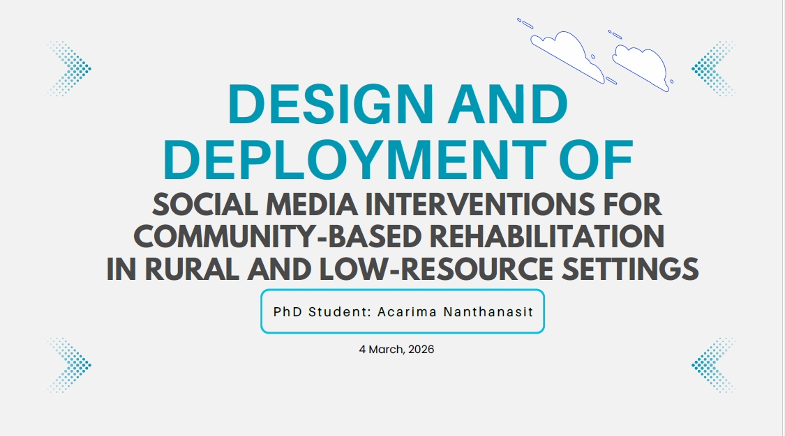 รองศาสตราจารย์ ดร.กรรณิการ์ อินต๊ะวงศ์ ได้รับเชิญเป็น External Examiner ในการสอบวิทยานิพนธ์ระดับปริญญาเอก หลักสูตร PhD in Digital Arts, School of Computing, University of Kent ประเทศสหราชอาณาจักร โดยวิทยานิพนธ์หัวข้อ “Design and Deployment of Social Media Interventions for Community-Based Rehabilitation in Rural and Low-Resource Settings” ซึ่งมุ่งศึกษาแนวทางการใช้สื่อสังคมออนไลน์เพื่อสนับสนุนการฟื้นฟูสมรรถภาพในชุมชน โดยเฉพาะในพื้นที่ชนบทและพื้นที่ที่มีทรัพยากรจำกัด
