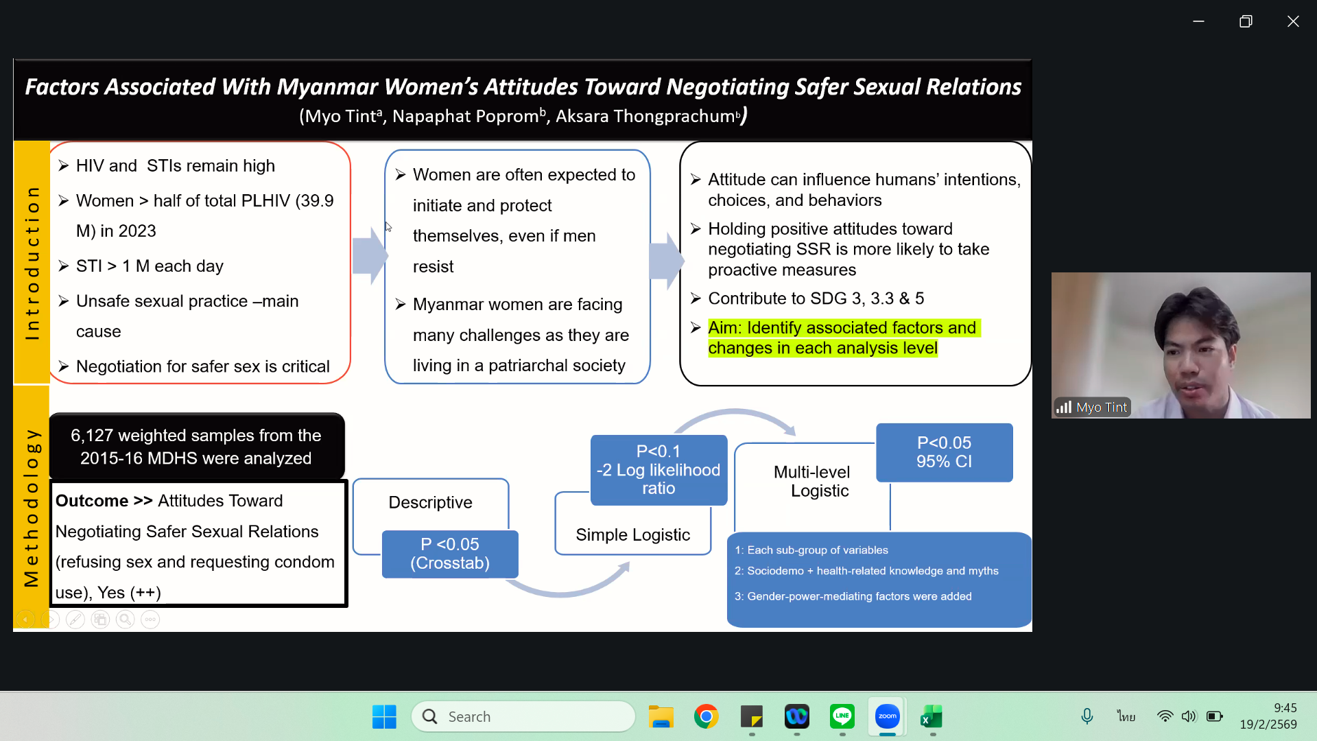 On February 19, 2026, Mr. Myo Tint, a Master’s student in the Master of Public Health (International Program), participated in and presented his research at the hybrid conference jointly organized by the University of Technology Sydney (UTS) in collaboration with Mahidol University, Chulalongkorn University, and Chiang Mai University. Held under the theme “Empowering Health Futures: Women, Technology & Care,” the conference brought together academics and students to exchange perspectives on advancing women’s health through innovation, equity, and interdisciplinary collaboration. Mr. Myo Tint presented his study titled “Factors Associated with Myanmar Women’s Attitudes Toward Negotiating Safer Sexual Relations.” His research examines key determinants influencing women’s attitudes toward safer sexual negotiation, contributing to broader discussions on women’s empowerment, gender equity, and reproductive health in the regional context.
