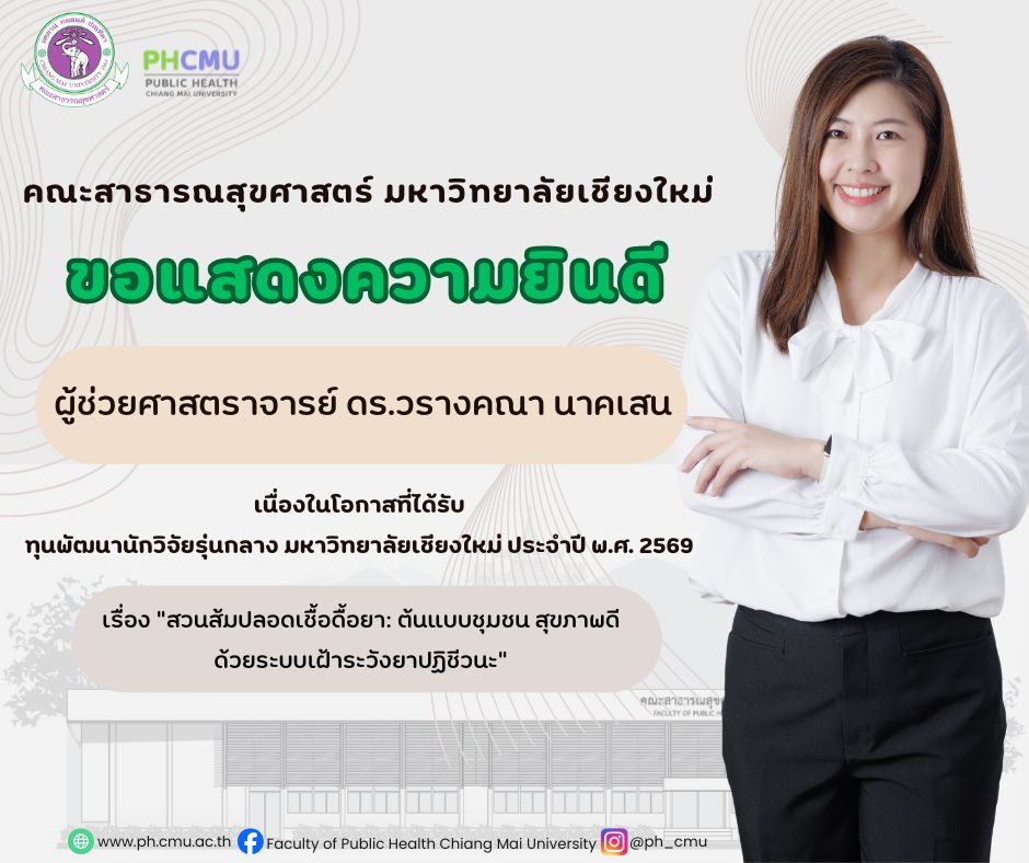 คณะสาธารณสุขศาสตร์ มหาวิทยาลัยเชียงใหม่ ขอแสดงความยินดี อาจารย์สังกัดคณะสาธารณสุขศาสตร์ จำนวน 2 ท่าน เนื่องในโอกาสที่ได้รับทุนพัฒนานักวิจัยรุ่นกลาง มหาวิทยาลัยเชียงใหม่ ประจำปี พ.ศ. 2569